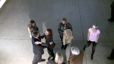 The men wear black T-shirts, jeans and green trainers, the women pink T-shirts, rose quartz necklaces, black trousers and black shoes. All in all, their clothing is unobtrusive and not particularly fashionable. They are noticeable only by their sheer numbers and because they are wearing the same as the Adam and Eve figures in the video installation. The performance takes place unannounced. The Participants are briefed to react with surprise when asked about their identical outfits.