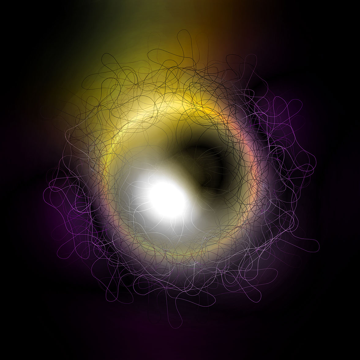 In "celestial bodies" from 2020/21, the finesse of form-finding in digital processes is taken even further. A mesh of lines is given apparent three-dimensionality by virtually placed light sources and clouds of color. In numerous variations of these line tangles, shifts of foreground and background, density and depth are depicted. The eye accustomed to images recognizes the kinship with the fascinating images of dying or emerging galaxies. The celestial bodies of Birthe Blauth were born in her mind. They get their captivating, scientifically seeming stringency through the perfection of the execution