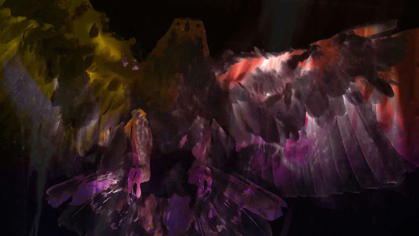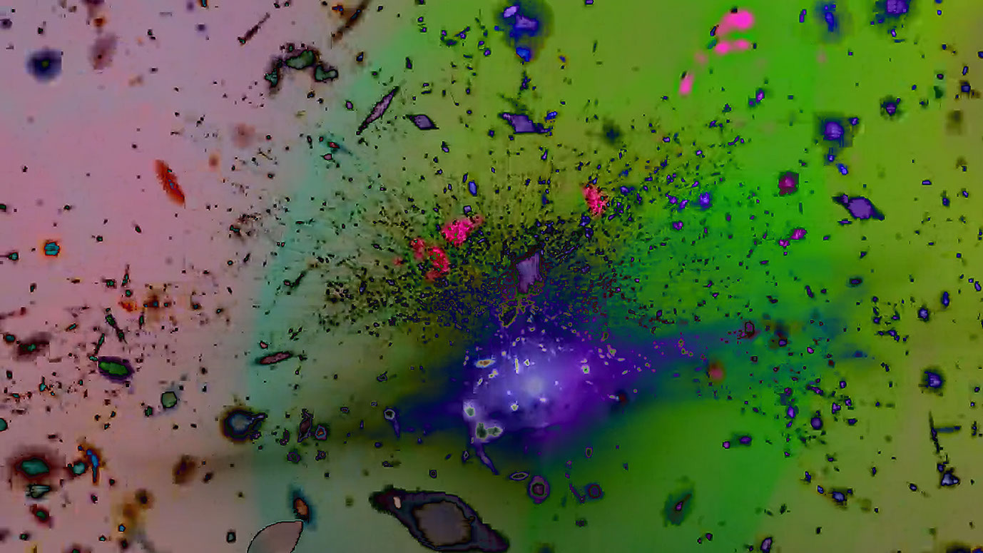 A world emerges from image noise and the cycle of life of man and nature begins. Love and trust as well as aggression and destruction are part of it. One changes into the other. In the middle everything burns in hellfire. From this the phoenix rises as a symbol for rebirth and immortality and flies over snow-covered forests to a mountain peak. But also the mountain landscape dissolves. A cosmonaut appears and flies into space. Pulsars dance. Microcosm and macrocosm mix. The world dissolves and the journey goes through a wormhole into endless fantastic galaxies.