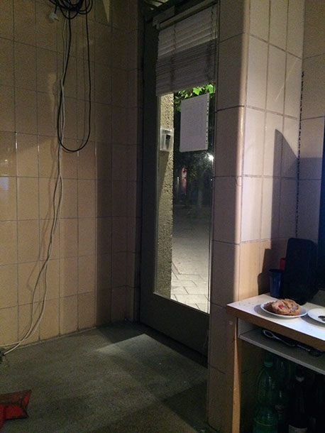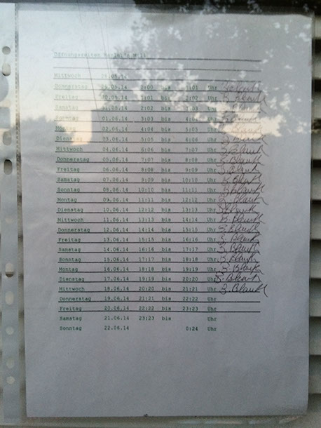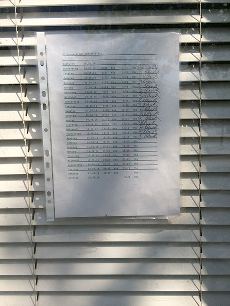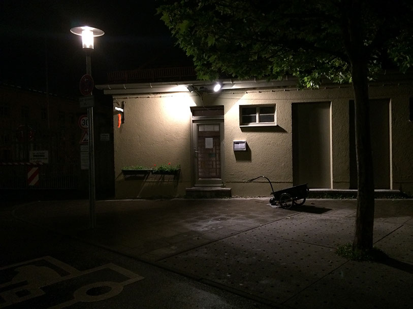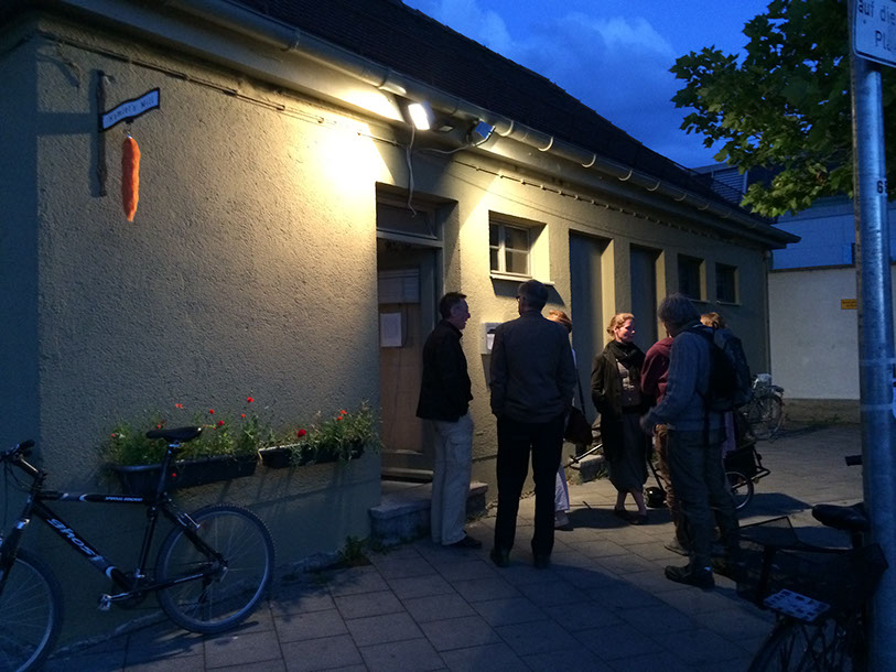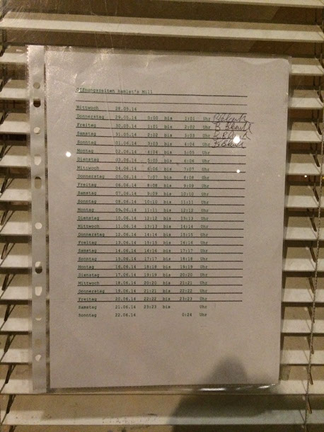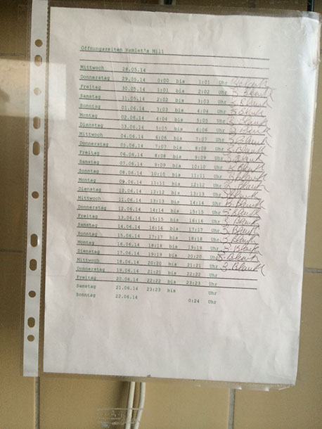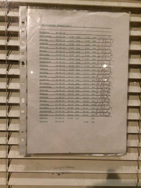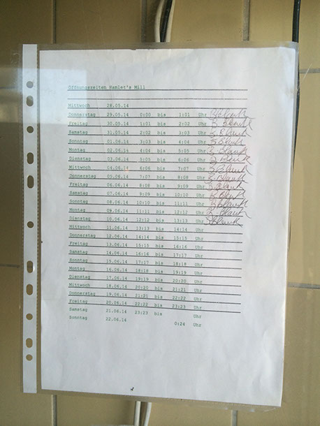 Hamlet’s Mill was materialised from 29 May 2014 onwards, starting at 0:00 hrs in the Klohäuschen in Munich/Germany. The Klohäuschen, a former public urinal, has an interior space of 8 m2 and is located at the western entrance to the wholesale market. Although still complete with all of its interior fittings, it has not been used for its original purpose for many years. Five years ago it was rediscovered by Anja Uhlig, who invited guests to reanimate it.