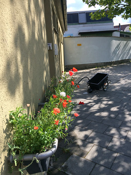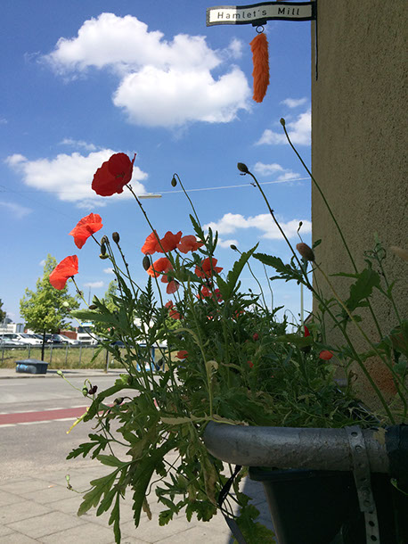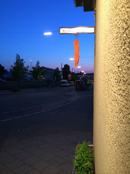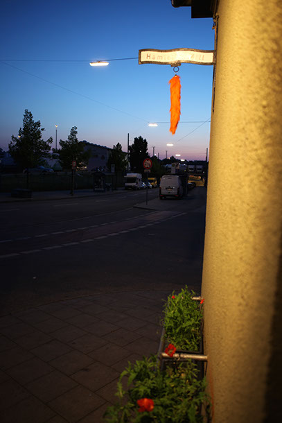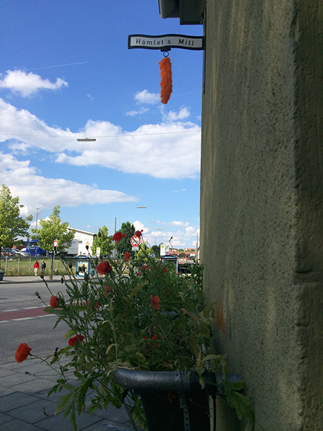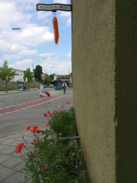 The other world was accessible at certain times only, on 24 different days for one hour and one minute precisely, starting at midnight on the first day and becoming later and later as the days go on, at precisely shifting points in time, pushing forward like the cosmic clock. Every object inside and around the KloHäuschen was both object and symbol. Out on the forecourt, for instance, stood an ordinary bike trailer; its contours resembled the cart shape of the circumpolar constellation of Charles’s Wain (“wagon”). The window-boxes were full of flowers; but rather than blooming with geraniums they were red with poppies, the flowers of the summer solstice, the devil, of fallen soldiers. On a metal sign hanging from the Klohäuschen the words “Hamlet’s Mill” suggested the name of an inn – but being written in old DIN 1451 typeface, which was long the norm for traffic-signs across Germany, they also hinted at a transit point to another world. And in keeping with the tradition of adding an image to a sign, a foxtail was hanging below, symbolising the other-worldly messenger of the ruler of the skies, often represented as a canid, often a fox with a burning tail.