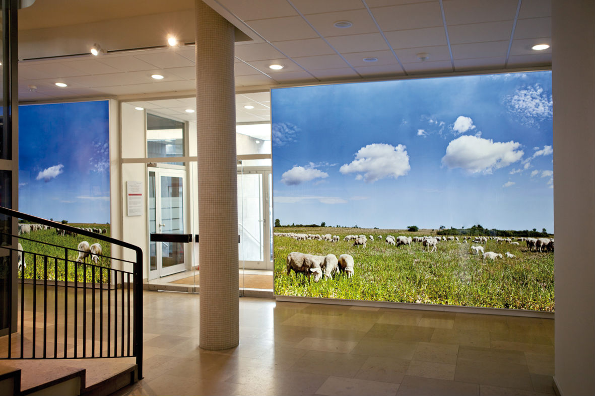 In the lobby, two light-boxes separated by a door cover the entire wall and present a scene of a wide, sunny pasture with a flock of grazing sheep. As a flock, sheep also represent us as human beings, with Jesus as our Shepherd. The lamb is the main attribute of John the Baptist. On the second floor, the images of these animals are reflected in calm waters. On the third, a rising wind appears to break the water’s surface and the creatures’ reflections break up in the ripples. On the fourth floor, their images are even more strongly deconstructed to create a sense of painterly depth. Everything appears to dissolve until finally, on the fifth floor, the im- ages of the sheep are completely washed over with water. What had previously been the sky on the ground floor has now become water, ultimately representing a heavenly ocean.