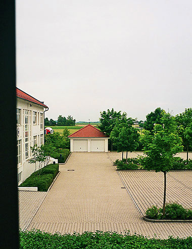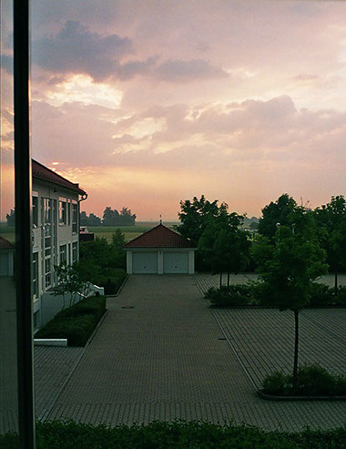 The scene is a small hotel on an industrial estate in the countryside. A morning photograph from the window of one of the guest rooms fades into an evening picture of the same view. The result is something linear that looks like time but actually consists of two points with nothing in between.