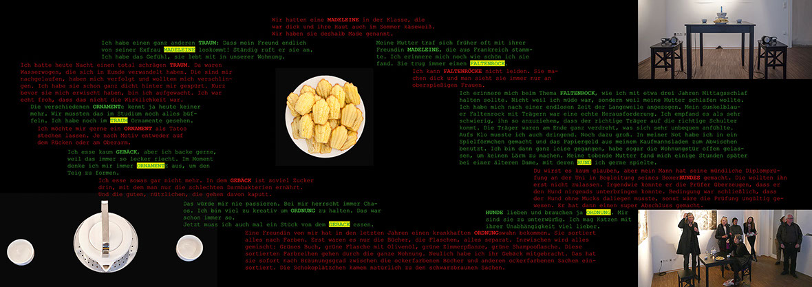 The installation with lime-blossom tea and madeleine refers to the madeleine episode of Marcel Proust’s In Search of Lost Time. In this scene the taste of a madeleine dipped in lime-blossom tea catapults the narrator back into a long-forgotten chapter of his past.