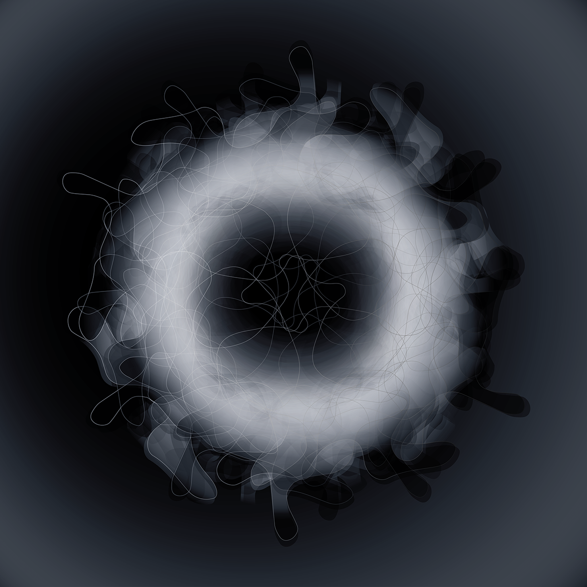 A shape was extracted from image noise and copied and rotated many times. Analogous to how a cell multiplies and a new organism is formed as a result. Light and shadow merge the forms into a unity, a fantastic star in the realm of possibilities.