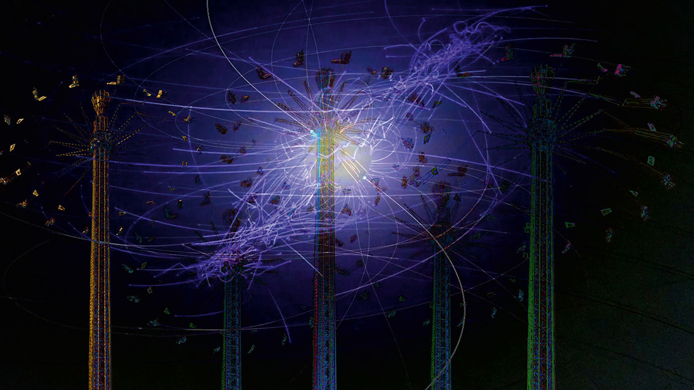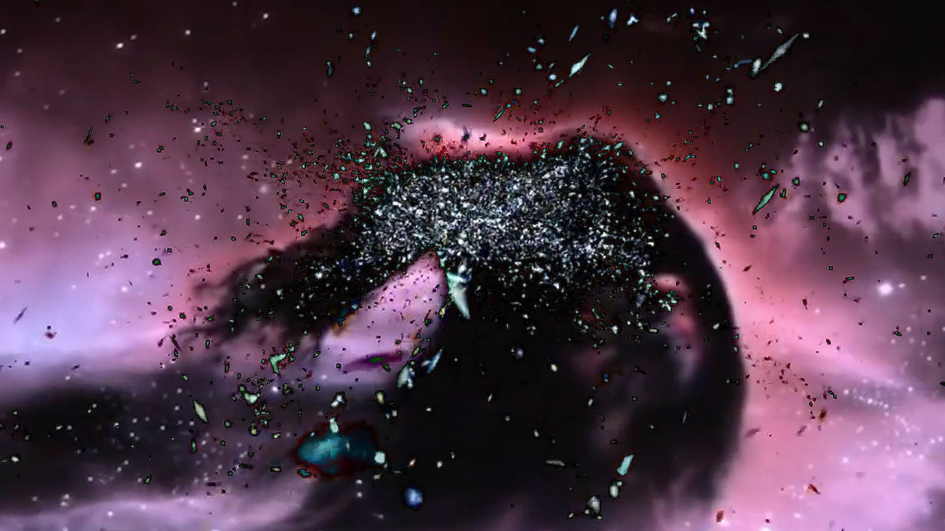 A world emerges from image noise and the cycle of life of man and nature begins. Love and trust as well as aggression and destruction are part of it. One changes into the other. In the middle everything burns in hellfire. From this the phoenix rises as a symbol for rebirth and immortality and flies over snow-covered forests to a mountain peak. But also the mountain landscape dissolves. A cosmonaut appears and flies into space. Pulsars dance. Microcosm and macrocosm mix. The world dissolves and the journey goes through a wormhole into endless fantastic galaxies.