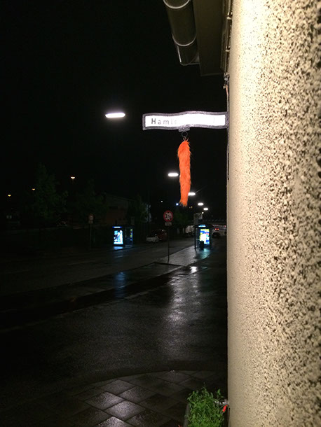 The other world was accessible at certain times only, on 24 different days for one hour and one minute precisely, starting at midnight on the first day and becoming later and later as the days go on, at precisely shifting points in time, pushing forward like the cosmic clock. Every object inside and around the KloHäuschen was both object and symbol. Out on the forecourt, for instance, stood an ordinary bike trailer; its contours resembled the cart shape of the circumpolar constellation of Charles’s Wain (“wagon”). The window-boxes were full of flowers; but rather than blooming with geraniums they were red with poppies, the flowers of the summer solstice, the devil, of fallen soldiers. On a metal sign hanging from the Klohäuschen the words “Hamlet’s Mill” suggested the name of an inn – but being written in old DIN 1451 typeface, which was long the norm for traffic-signs across Germany, they also hinted at a transit point to another world. And in keeping with the tradition of adding an image to a sign, a foxtail was hanging below, symbolising the other-worldly messenger of the ruler of the skies, often represented as a canid, often a fox with a burning tail.
