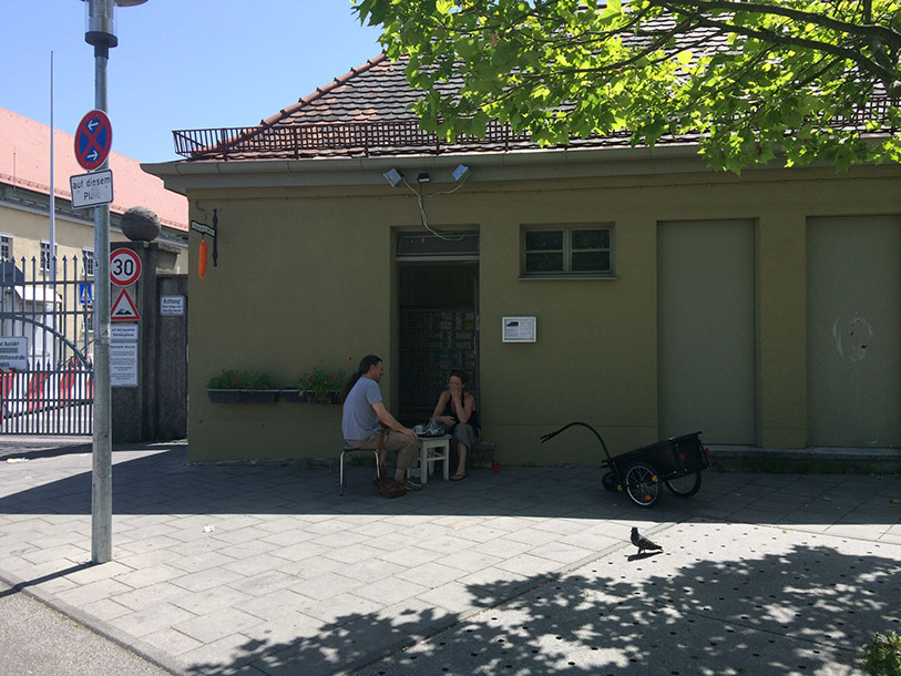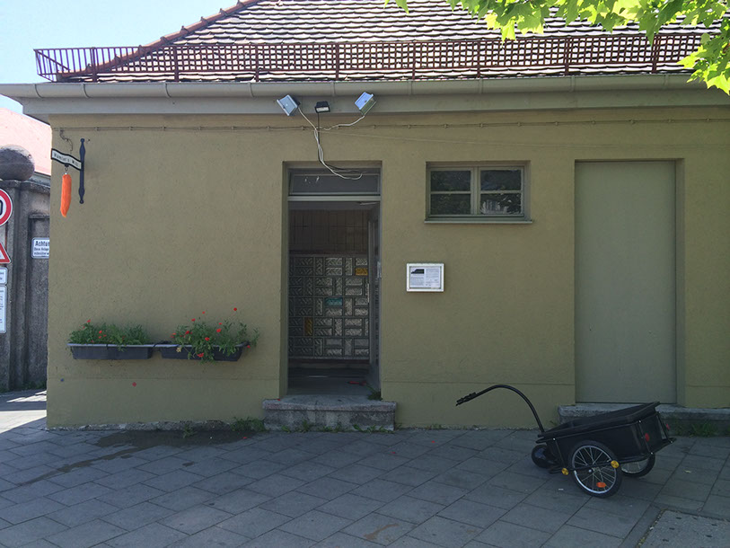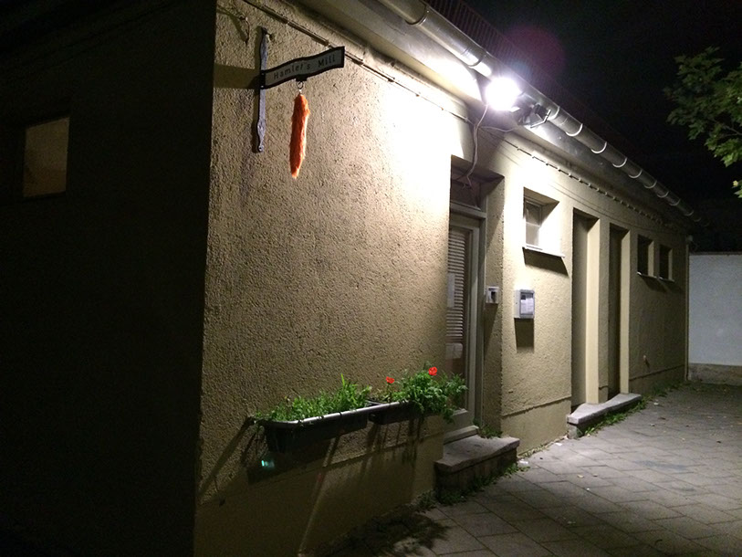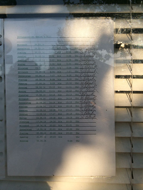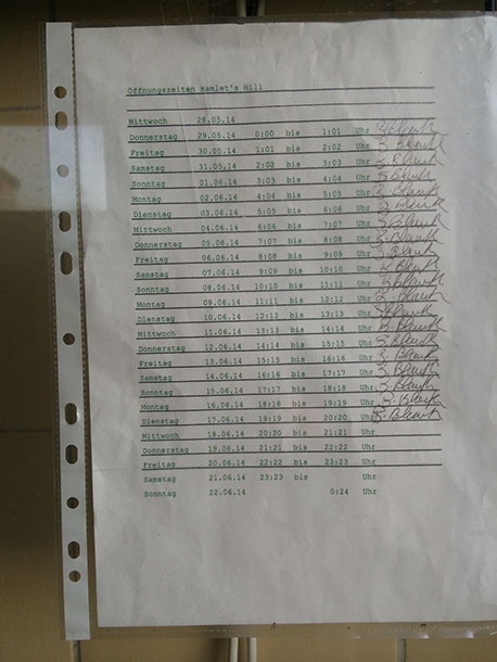 Hamlet’s Mill was materialised from 29 May 2014 onwards, starting at 0:00 hrs in the Klohäuschen in Munich/Germany. The Klohäuschen, a former public urinal, has an interior space of 8 m2 and is located at the western entrance to the wholesale market. Although still complete with all of its interior fittings, it has not been used for its original purpose for many years. Five years ago it was rediscovered by Anja Uhlig, who invited guests to reanimate it.